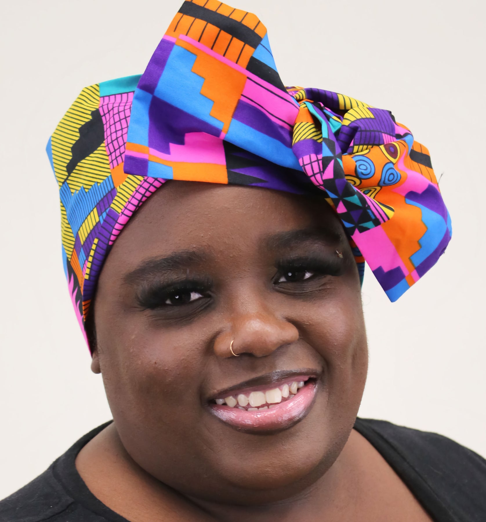 Woman wearing a colorful headwrap on a white background