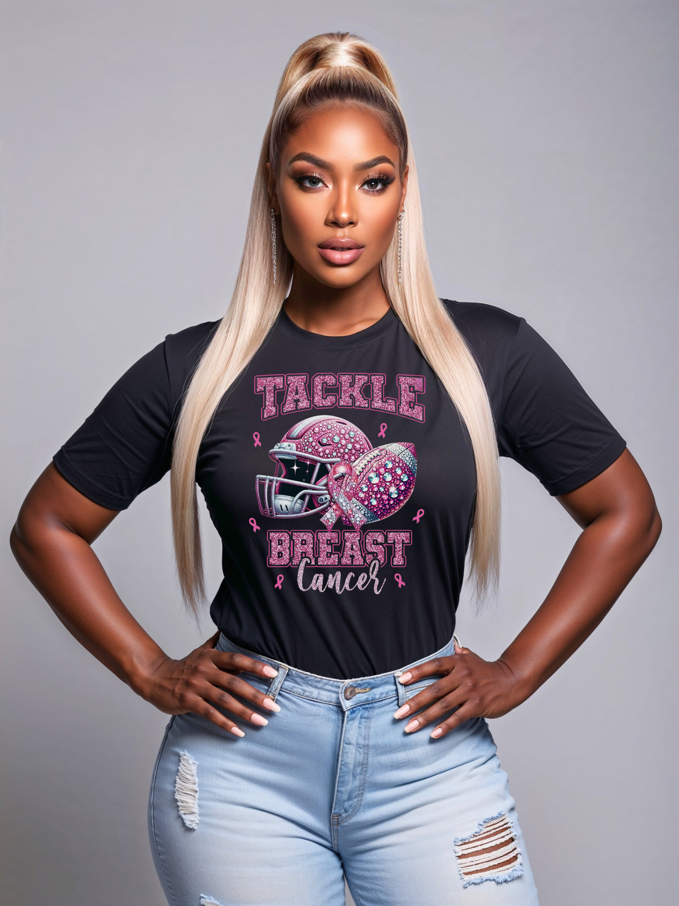 Whether on the field or in life, strength comes from standing together. Our “Tackle Breast Cancer” tee is more than fashion—it’s a statement of unity, hope, and power. Designed in HTV glitter with rhinestones, it shines as bright as the fighters and survivors it represents.