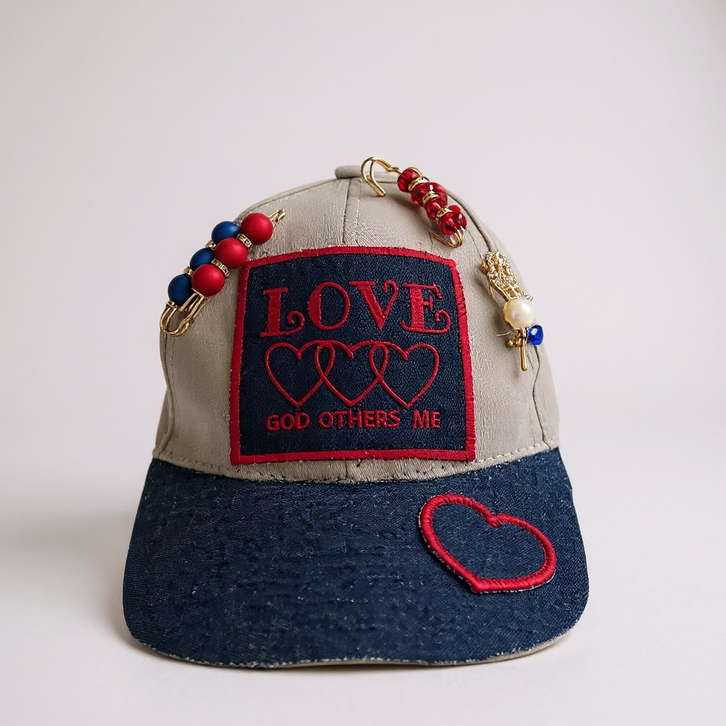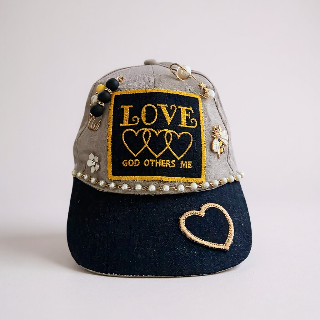 Designed for both fashion and faith, every hat features hand-selected beads, charms, and appliqués, making each one a unique work of wearable art. The heart outline stitched on the brim adds a thoughtful detail, while the adjustable back ensures a comfortable fit for all-day wear.