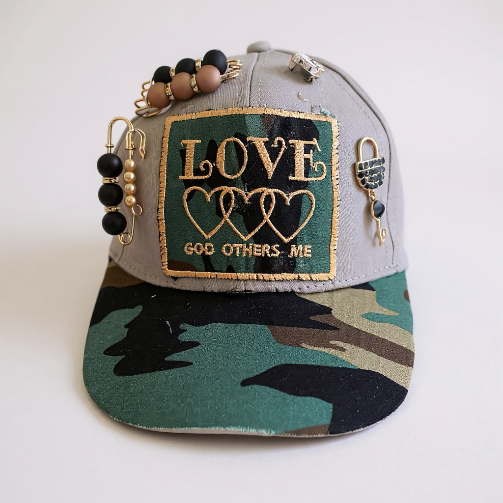 Celebrate the first and greatest commandment in style with our LOVE Commandment Embellished Baseball & Trucker Hat. Available in Black or Khaki, each hat is handcrafted with a sturdy denim brim and front patch embroidered with the powerful words: LOVE – God, Others, Me, framed by a triple-heart motif.